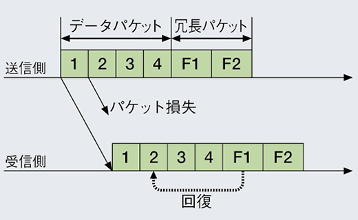 冗長パケットを用いた損失パケット回復技術です。パケットロスに対する備えとして、送信側がオリジナルデータパケットから冗長パケットを生成。受信側は、そのオリジナルデータパケットと冗長パケットを用いることで損失パケットを回復できます。冗長パケット数の増加による回復機能の向上と、ネットワークの混み具合に合わせて冗長パケットの生成量を調整する機能(Adaptive FEC)を搭載しています。