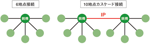 多地点接続用ソフトウェア(別売)をインストールすることで、親機になることができます。1台を親機とした場合、最大6地点の同時会議が行え、2台の親機をIPネットワークによりカスケード接続することで、最大10地点の同時会議が可能になります。IPネットワークとISDN回線の混在通信に対応しています(*)。