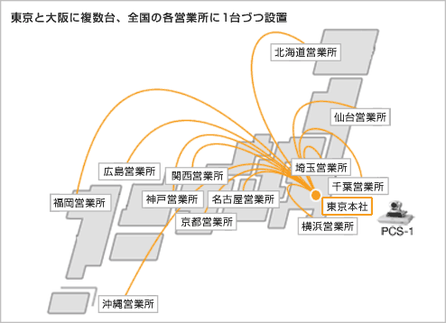 東京本社と全国営業所のすべての会議室にビデオ会議を設置。 原則として、東京本社と全国営業所のすべての会議室にビデオ会議を設置し、会議室さえ予約すれば、誰でも自由に使えるようにしています。ビデオ会議システムが使われない日はあり得ません。「電話のかわり」という感覚で、みんなあたりまえのように使っています。東京本社はビルの2階・4階・9階に分散しているのですが、フロアー間のミーティングにも頻繁に使われています。大きな会議室がなくても、各会議室にビデオ会議システムがあれば、非常に機動的な会議運営が可能になるわけですね。 それから、毎日の朝礼にも活用しています。朝のちょっとした時間を使って、全社員が同じ情報と認識を共有できるのは非常に有益です。