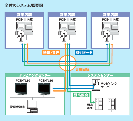センター側にオールインワンタイプ、店舗側にルームタイプを採用。 「テレビバンク」は、旧東京三菱銀行の各営業店舗のATMコーナーに設置した専用ブースと、新宿にあるテレビバンクセンターとをブロードバンドで結び、個人のお客様とオペレーターが直接コミュニケーションを取りながら、各種手続きや相談などの窓口業務を行っています。テレビバンクセンター側のオペレーター端末には、オールインワンモデルのPCS-TL50を採用。また各営業店舗のお客様用のブースには、ルームタイプのPCS-11が採用されています。