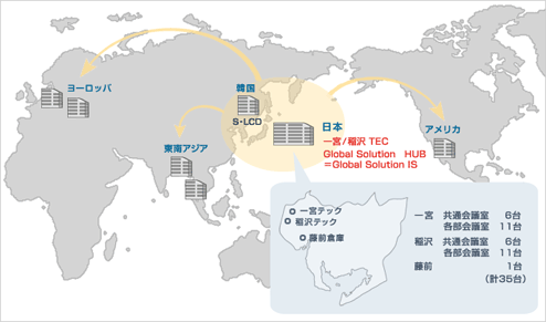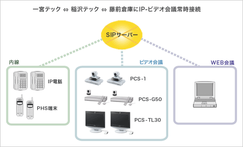 各拠点・部署におけるビデオ会議システムの用途や利用シーンを想定した上で、それぞれに最適な機種を選定しました。ハイパフォーマンス・スタンダードモデルのPCS-G50とセットトップモデルのPCS-1は、IP回線による国内常時接続を行うことと、海外拠点とISDNで接続する可能性を考慮して選択しました。多地点接続を行うMCU機能が内蔵されており、音声品質が非常にクリアである点も評価しました。特に音声品質は、他社製品に比べて高品質だと感じています。コンパクトなオールインワン・エントリーモデルのPCS-TL30は、ヨーロッパやアメリカ、東南アジアと頻繁に打合せを繰り返すエンジニア部門のマネージャー向けに導入しました。最初は試験的に導入したのですが、自分の席に座ったまま電話感覚で使用できる手軽さと、パソコンのモニターとしても活用できる利便性・省スペース型が社内で評判を呼び、半年ほどの間に19台もの導入・増設を行いました。また、社内のIT環境をSIP連携することが決定していましたので、ソニーのビデオ会議システムがSIPに対応しており、VoIPシステムとの連携が可能であることも決め手となりました。(加藤様) モデルを使い分けて合計35台のビデオ会議システムを導入。 ビジネスオペレーションの一体化を実現するシステムとして、SIPサーバーをコアとしたITネットワークを採用し、一宮テックと稲沢テック、藤前倉庫の3拠点を社内ネットワークで繋いでいます。ビデオ会議システムは、SIP対応と多地点接続対応、急増しつつある海外拠点との接続を考慮して、ハイパフォーマンス・スタンダードモデルのPCS-G50と、セットトップモデルのPCS-1を親機として構成しています。海外とのやりとりは、ヨーロッパ、アメリカ、韓国、東南アジアがメインです。このうち東南アジアは通信状況が悪いため、音声会議を行うなど、多彩な会議方法を用意してビジネススピードをあげています。オールインワン・エントリーモデルPCS-TL30は、1対1など主に少人数での会議で活用しています。(今枝課長・加藤様)