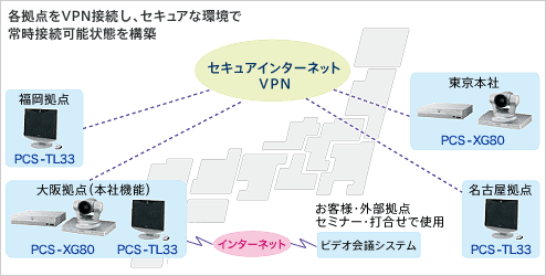 2台のPCS-XG80と3台のPCS-TL33をイントラネットVPNで接続。 2009年4月に、東京本社と大阪・大手前オフィスにPCS-XG80を各1台、大手前オフィスと名古屋オフィス、福岡オフィスにオールインワンモデルのPCS-TL33を各1台導入しました。PCS-XG80にはHDデータソリューションソフトウェアを、PCS-TL33にはデータソリューションモジュールを追加してPC画面を共有しています。また、大手前オフィスのPCS-XG80にHD多地点接続用ソフトウェアを搭載し、多地点接続を実現しました。回線はイントラネットVPNを使用し、2Mbpsまたは4Mbpsで接続しています。(岩崎様・丸澤様)