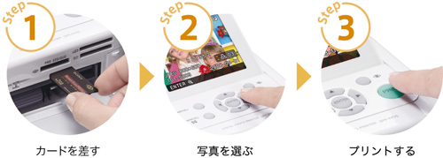 「カードを差す」→「写真を選ぶ」→「プリントする」の3ステップでかんたんにプリント。ボタンは大きく押しやすくかんたんに操作できます。