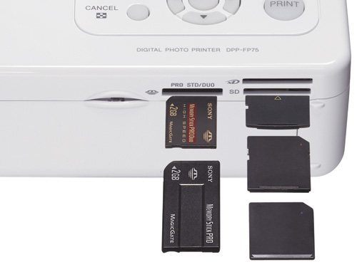 メモリーカードスロットは“メモリースティック”/“メモリースティック デュオ”、SD/SDHCメモリーカードに加え、xDカードのダイレクトスロットを搭載。“メモリースティック デュオ”はアダプターなしでそのままを差し込んでプリントできます。