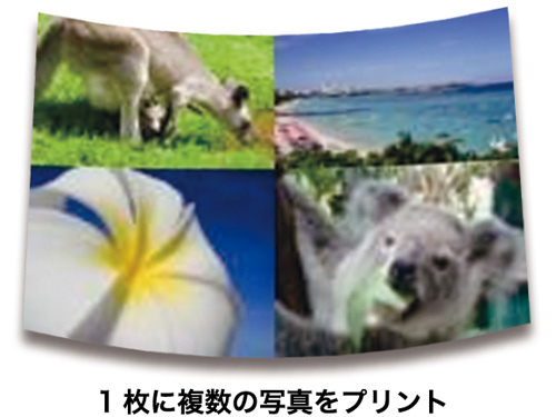複数の写真を、1枚の用紙に割り付けてプリントできます。Lサイズの場合、2分割、4分割、9分割に。ポストカードサイズの場合は2分割、4分割、9分割、13分割、16分割で印刷ができます。