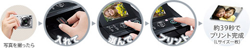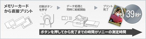 ソニーのプリント時間(*)は、印刷ボタンを押してから排紙が完了するまで。印刷ボタンを押すと、データ処理と給紙を同時に開始し、無駄のない動作でスピーディーにプリントをこなします。また、高画質・高容量の画像データもすばやくプリント。デジタル一眼レフカメラ“α”で撮った写真も、スピーディーにプリントできます。