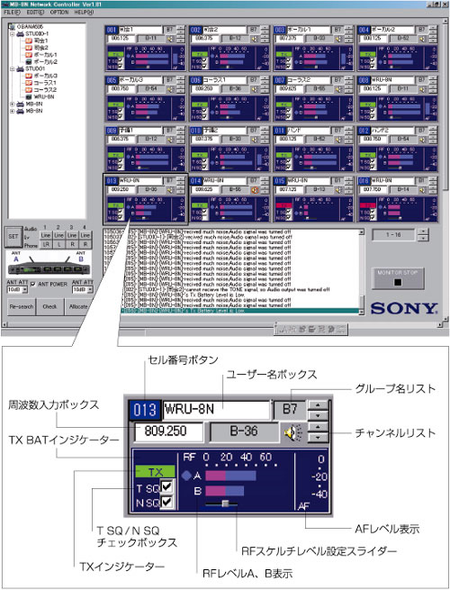 MB-8Nのオーディオ出力レベル・ヘッドホン出力・アンテナへのRFアッテネーター/電圧出力などの各種設定に加え、WRU-8Nの受信グループ/チャンネル・周波数、音声出力レベル・高周波入力レベル、対応する送信機のバッテリーアラーム(*2)もモニタリングすることができます。さらにWRU-8Nに内蔵された豊富なチャンネルプランの設定機能も搭載。多チャンネル運用時でも簡単に用途に適したチャンネル設定が可能です。
