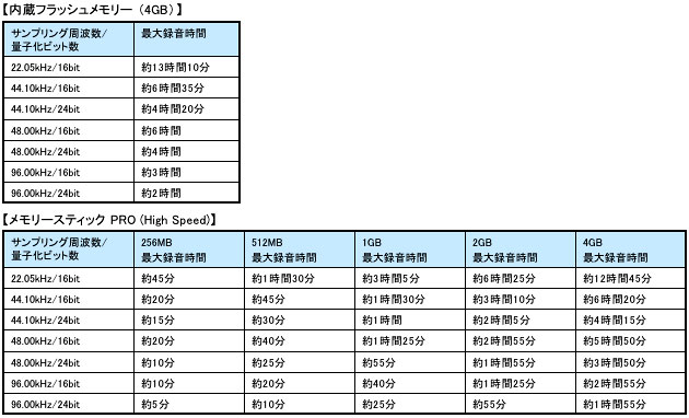 録音時に音を圧縮しないリニアPCM方式を採用。音の織りなす表現までリアルに記録することができます。また、96kHz 24ビットでの録音は、 44.1kHz 16ビットの音楽CDよりも、密度ある豊かな音質を実現。記録媒体には、耐久性・振動に強く駆動ノイズが発生しないフラッシュメモリー 4GBを搭載。さらに“メモリースティックPRO”(Hight Speed)にもダイレクトに記録できます。