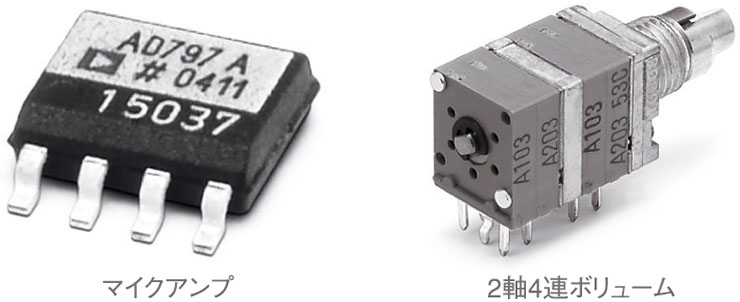徹底したノイズ軽減のために、ひとつひとつの部品を厳選しました。マイクアンプには、低雑音、低ひずみを特長とするAnalogDevices社のAD797を左右独立で搭載。入力される音声信号の増幅率を左右それぞれ調整でき、実質的なSN比を向上しています。コンデンサーには、電解紙に合成雲母粉末紙を使用したエルナー社製を採用。録音ボリュームには、従来に比べ約10倍の寿命を持つ2軸4連ボリュームを新たに開発しました。さらに、ハンダにも音楽専用の特殊なものを使用しています。