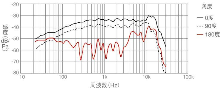 高感度で低ノイズのマイクを開発。筐体には真鍮の削り出し加工による精度の高い部品を使用。各備品の取り付け位置や前後の開口寸法を100μm単位で調整。微妙な差が音に影響するマイク内部の空間を、より適した状態に設計しました。この結果、周波数特性は30kHz近くまで広げられ、ピークやディップを抑えて安定した録音環境が確保されています。また、一般的にマイクの構造部品として用いられる柔らかな素材は、音を吸収する性質があるためあえて排除。マイク部は金属部品だけの締結構造を採用。微細な音までしっかり伝える仕上げになっています。さらに、振動板に伝えられた音を電気信号に確実に変換する工夫も施し、約−32.0dB/Pa 1kHzの高感度を実現しました。