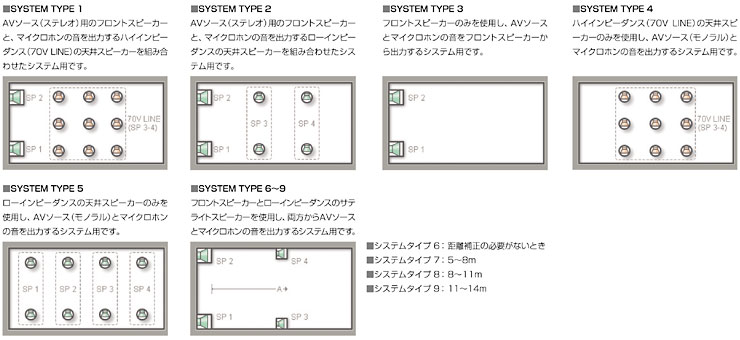 あらかじめ9通り(システムタイプ、1-9)の代表的なアプリケーション例をプリセットしているので、スイッチを切り換えるだけで、さまざまなAVシステムの設定が可能。複雑な操作なしで、容易に希望するシステムが構築できます。各システムタイプには、次の項目がプリセットされています。
