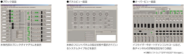 外部パソコン接続用のRS-232C端子を装備。本機の内部設定を行うためのソフトウエア「SRP-X500P Manager」を、付属のCD-ROMからお手持ちのパソコンにインストールすることにより、以下の項目の詳細設定が可能です。