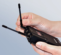 カムコーダーへの取り付けを考慮した受信機のアンテナ設計新谷 ソニーのポリシーでもあります「安定した伝送系」「多チャンネル同時運用」については、UWP-V1においても継承されています。最近のワイヤレスマイクの環境としては、アナログ・デジタルの混在や、不要電波も多くなっていますので、混信による妨害に関しては、以前にも増して注意を払いチューニングを行いました。また、「UWP シリーズ」の受信機は小型カムコーダーへ取り付けることが多いので、スペースダイバーシティー用に2 本装備したアンテナは、自由に角度を調節できる機能や受信効率は そのままに、旧型のものに比べ一回り細い径にして、より取り扱いやすいものにしました。
