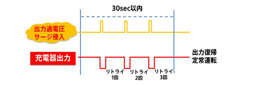 落雷などによる瞬間的なサージにより出力過電圧が発生した場合、30秒間に3回まではリトライを繰り返し自動復帰できます。