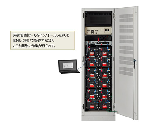 BMUで蓄電池の状態を常時監視。日常点検の中で装置を稼働させたまま数分で精度の高い寿命診断ができ、装置の計画的な運用・メンテナンスにつなげられます。