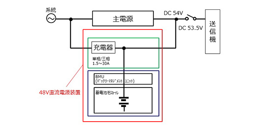 送信機の入れ替えは、いかに放送を止めずに行うかを考えなくてはなりません。デジタルの中継局の局舎は、装置を並べるのに十分なスペースがありません。バックアップ用直流電源装置のスペースが減れば、その分、送信機更新のためのスペースを作ることができます。リチウムイオン電池であれば、コンパクトに設置ができ送信機の更新スペースを確保することが可能になるのです。