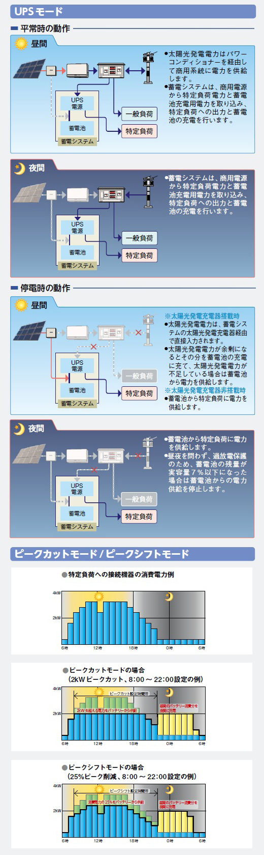 また、操作パネルの運転モード設定ボタンで、UPSモード、ピークカットモード、ピークシフトモードを選択することができます。ピークカットモード、ピークシフトモードでは、商用電力のピーク時に商用電源の消費を抑制に効果を発揮します。