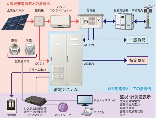 この蓄電システムは、太陽光発電および商用電源から充電し、災害時など商用電源の停電時には、蓄電池に充電した電力を使用して電力の継続使用を可能にします。