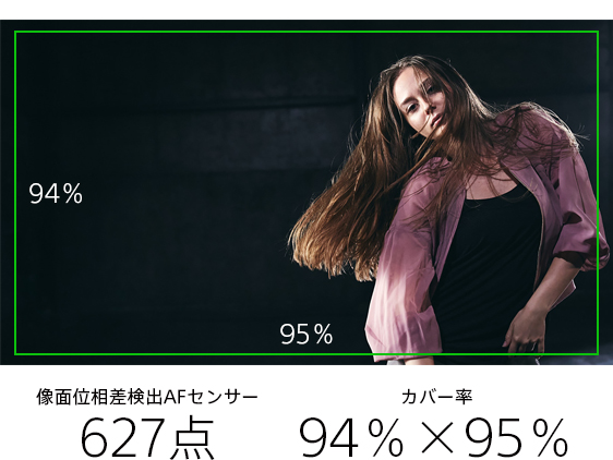 新開発の有効約1026万画素のイメージセンサーで実現する高感度性能と、高速・高精度な像面位相差AFを搭載。さらに、進化した画像処理エンジン「BIONZ XR」との組み合わせで、最大でイメージセンサーの撮像画面のほぼ全域(縦方向:約94%、横方向:約95%、全体:約89%)に配置された627点の選択可能な位相差測距点を用いて、広範囲からの膨大な被写体情報を、リアルタイム処理に優れた新画像処理エンジンがパワフルに処理し、高精度・高密度に分析。浅い被写界深度でも、動きの速い被写体に高精度かつなめらかに、ワイドなエリアでフォーカスを合わせ続けます。