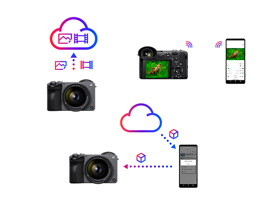 ソニーのクラウド制作プラットフォーム「Creators’ Cloud」のモバイルアプリケーション「Creators’ App」に対応。撮影や素材データ管理、カメラ機能のアップデート等の撮影前の準備に関係するワークフローを効率化できます。 ●クラウドアップロード:カメラから直接、またはスマートフォン経由(Wi-Fi, 有線)で撮影データをCreators’ Cloudストレージへアップロードができます。Creators' Cloudに保存されたデータは、ワークフローに合わせてGoogle Drive(TM)、Adobe Lightroomなどのクラウドサービスに転送できます。 ●スマートフォンをリモコンに:スマートフォンから撮影、バッテリー情報の確認などリモコンとして使用可能です。 ●カメラ機能を強化:スマートフォン経由で、カメラを最新ソフトウェアにアップデートすることができます。また、Creators’ Cloudに保存したLUTファイル(.cube)をカメラにインポートすることが可能です。