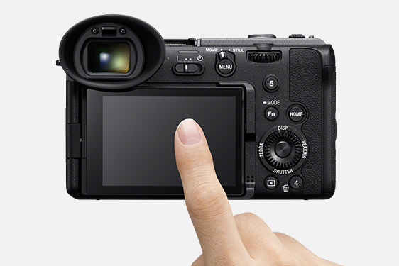 バリアングルタイプの横開き背面モニターを搭載。横方向に176度、上方向180度、下方向90度と、自在に可動する調整可能なバリアングル機構で、手持ち撮影、ジンバル撮影や自分撮り、地面すれすれのローポジションでの迫力ある撮影など、状況に応じた自由なポジションやアングルでのフレーミングができます。また、HDMI接続時もケーブルが干渉せずに角度調整ができます。さらに、3.0型、約103万ドットの大型タッチパネル液晶は、屋外撮影時の視認性に配慮し、屋外晴天モードや手動設定に対応。タッチトラッキングやタッチフォーカスに加え、メニューやファンクションメニューのタッチ操作も可能です。