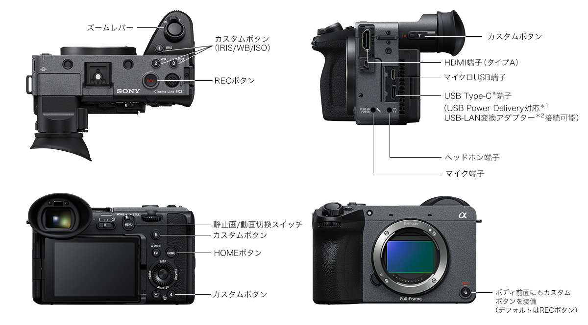 *1 USB充電、給電にはUSB Type-C(R)端子のみ対応。USB給電を行うには、バッテリーを本機に挿入してください。アダプターや本体動作によってはカメラ内のバッテリーが消費することがあります *2 5GHz帯域に対応した機器の使用はお使いいただく国により制約があります
