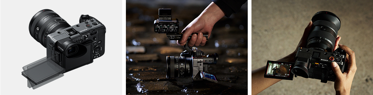 FX3およびFX30と同様、フラットトップが特長的な一眼カメラスタイルのコンパクトな筐体は長時間の撮影でも疲れにくく、安定したホールドに配慮したグリップ形状は、プロのクリエイターへのヒアリングを基に設計し手持ち動画撮影のための使い勝手を追求しました。小型・軽量な純正レンズとの組み合わせで、システムとしても高い機動力を発揮します。また、手持ち撮影だけでなく、ジンバルやドローンとの親和性が高く、フレキシブルな撮影スタイルを実現します。