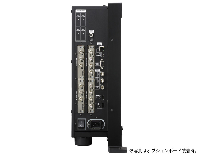 720×576/50iから1920×1080/50p、60pまで、および、デジタルシネマ(D-Cine)の2048×1080/24p、さらに1920×1080までの各種コンピューター信号と多様な入力信号に対応します。インターフェースには、標準入力として3G/HD/SD-SDI(2入力)とHDMI(HDCP対応)とDisplayPort信号入力を装備しています。また4つの入力オプションポートを装備しており、別売の入力オプションボードを組み合わせて、3G-SDI、HD-SDI、SD-SDI入力を拡張したり、デュアルリンクHD-SDI、RGB、YPbPr、Y/C、コンポジット信号入力に対応します。