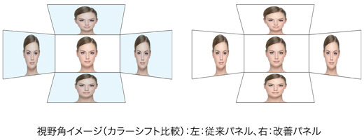 新規開発した有機ELパネルにより、弊社従来パネルに比べて視野角による色の変化が半分以下(*2)になりました。