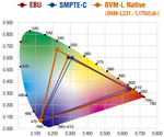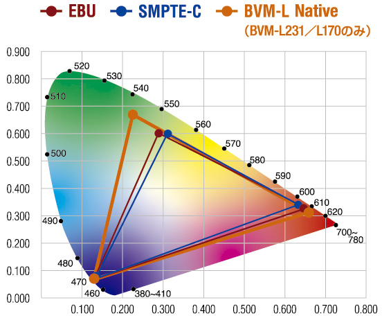 高純度LEDを使用したプレジションバックライトと独自の3DLUT(LOOK UP TABLE)を使用したカラーマネジメントシステムにより、放送規格EBU、SMPTE-C、ITU BT.709の色域を正確に再現します。
