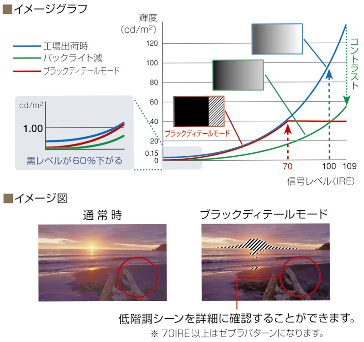 ・ブラックディーテールモードは、黒レベルは、通常表示時(100%信号時100cd/m2)の40%程度まで下げることが可能です。高階調部(約75IRE以上)は回路のダイナミックレンジによりクリップされますが、クリップされる部分はゼブラパターンを表示することができます。(切り換え可能)