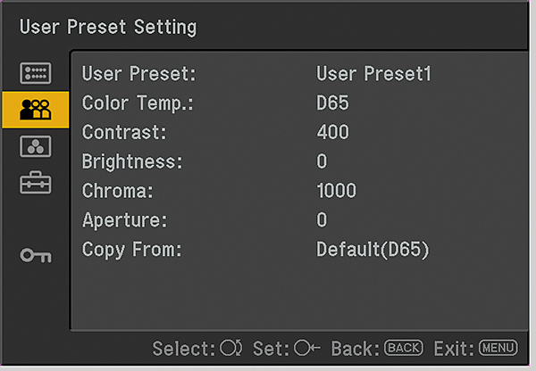 色温度の「User1」とユーザープリセットの「User Preset1」に保存した設定の変更が効かないように、パスワードで保護できます。