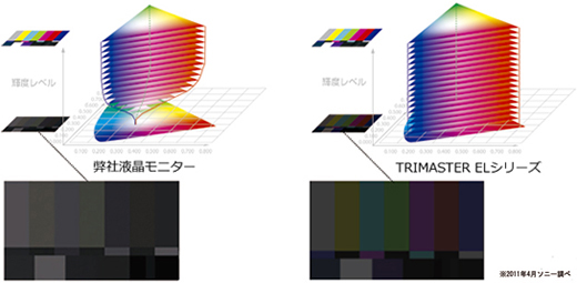 独自の広色域有機ELパネルと独自のカラーマネジメントシステムにより、業界トップクラスの広色域を実現します。デジタルシネマの規格DCI-P3の色域を包含し、UHD(Ultra HD)の放送規格ITU-R BT.2020の色域に対応します。また、ソニーが定義する広色域規格S-Gamut3、S-Gamut3.Cineや従来の放送規格ITU-R BT.709、EBU、SMPTE-Cにも対応し、放送用途から映画制作における広色域映像をモニタリングできます。