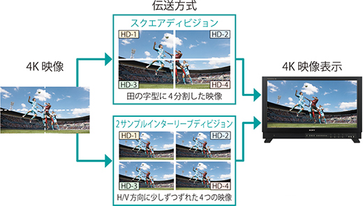 標準でHDMI(HDCP 2.2対応)入力、2系統の3G/HD-SDI×4入力のインターフェースを搭載(*)し、スクエアディビジョン信号と2サンプルインターリーブディビジョン信号に対応します。3G/HD-SDI×4本で3840×2160/24、25、30、50、60pまでと4096×2160/24、25、30、48、50、60pの信号までを表示できます。また、4K/QFHD表示のほか、2K/HDズーム表示に対応しました。