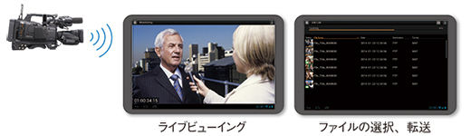 Wi-Fi接続したスマートフォン/タブレットなどのモバイル端末から専用アプリケーション「Content Browser Mobile」(*1)を使用して、ライブ映像のビューイングやプロキシファイルのプレビュー、ファイルの転送指示、カムコーダーのコントロール(*2)などが可能です。
