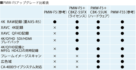 従来PMW-F55のみが対応していた、本体でのXAVC 4K記録、SDI/HDMIによる4Kプレイバック、XAVC 4KとMPEG HD422の同時記録を可能にするソフトウェアライセンスです。PMW-F5アップグレードキットCBK-55UK(別売)とあわせて、PMW-F5に対し段階的な機能追加が可能となります。