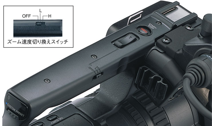 ハンドルの掴みやすさ、手袋を付けたままでのオペレーションを考慮し、ハンドルの高さをDSR-PD150に比べ約10mmアップ。また、レンズグリップとは別にハンドルにもズームレバーおよびRec Start/Stopボタンを配置しました。ズームレバーは誤操作を防ぐOFFおよびL/Hのズーム速度切り換えスイッチを備えています。これらにより、ローアングル撮影姿勢や片手でのREC操作、またズーム時に一定速度を保てるなど、使い易さを向上しました。