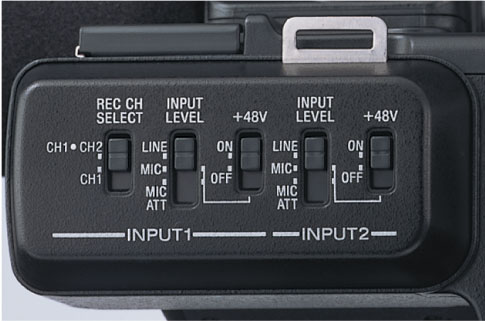 XLRコネクターを2系統装備。チャンネルごとにLINE/MIC/MIC ATT(−20dB)の入力切り換えおよびコンデンサーマイクロホンへの48V電源供給ON/OFFが可能。付属モノラルマイクロホンの他、XLRコネクターを備えるマイクロホンや音響設備からのライン入力に対応します。