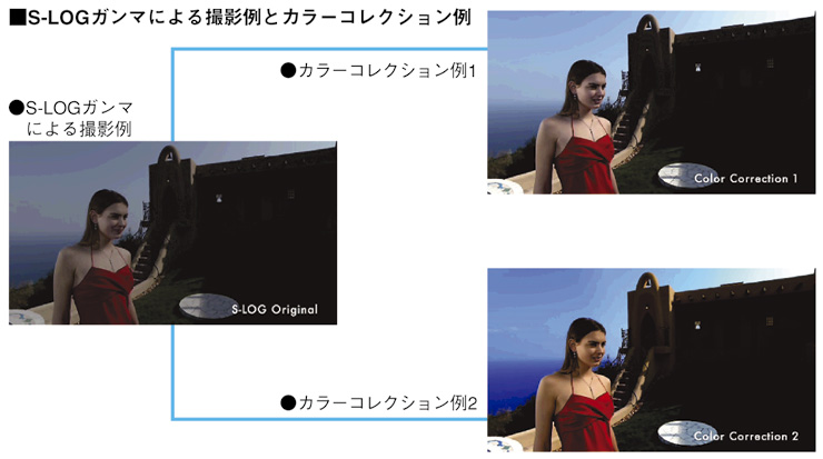 S-LOGガンマは、ネガフィルムの感光特性に迫る広いラチチュードと、CCDの持つ黒付近の色再現性の高さを生かし、白飛びや黒つぶれの影響を最小化した階調表現力を実現します。これによりポストプロダクション作業におけるカラーコレクションの自由度が広がります。
