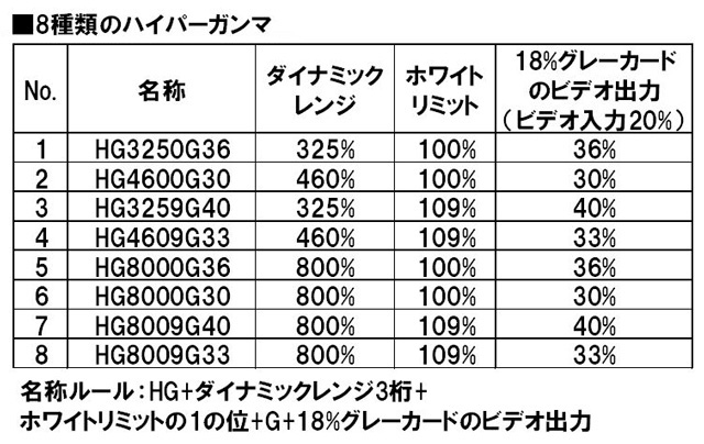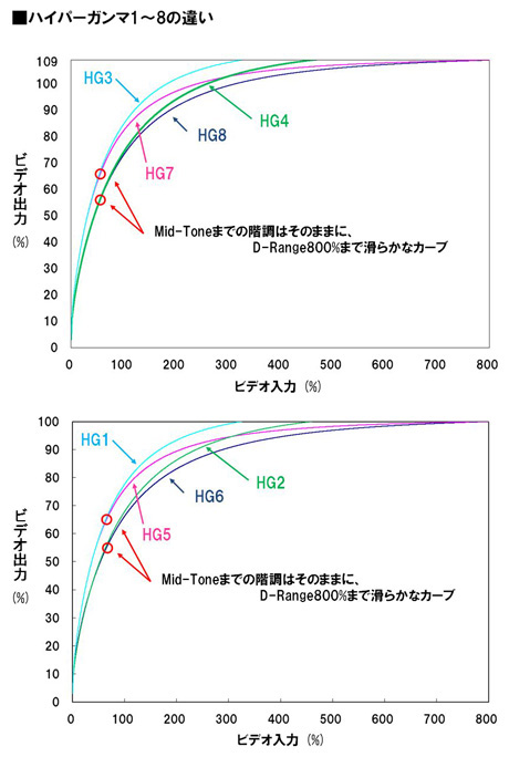 ハイパーガンマは、一般的なモニターディスプレイの再現特性であるITU-R709の特性をベースとしつつ、Knee(ニー)機能を使用せず滑らかに高輝度部分を圧縮することで、広いダイナミックレンジを実現します。また、一般的なモニターディスプレイによる撮影現場でのモニタリングも可能です。