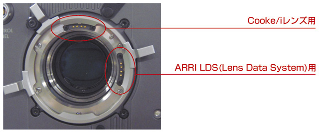 ARRI LDS(Lens Data System)とCooke/iレンズに対応することで、レンズデータインターフェースを確立しました。これによりレンズファイルの自動選択や、レンズ型番・アイリス・フォーカスなどのレンズデータをメタデータとしてHDCAM-SRテープもしくはメモリースティックに記録できます。レンズのシリアルナンバーを元にレンズファイルを自動選択することも可能です。12ピンレンズコネクターはレンズサーボコントロールやRecトリガー用ユーティリティー電源を確保することができます。