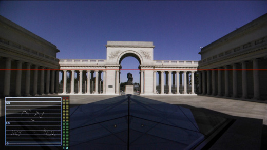 入力信号の波形やオーディオレベル(エンベディッドオーディオのみ対応)、ベクトルスコープを画面に表示できます。ウェーブフォーム選択時はラインを表示させ、ライン位置の波形を表示や、20IRE部分の拡大表示が可能です。また、ベクトルスコープ選択時はターゲットを75%と100%に切り替えが可能です。