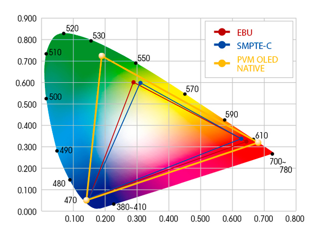広色域有機ELパネルにより、放送規格ITU-R BT.709、EBU、SMPTE-Cの色域を正確に再現します。