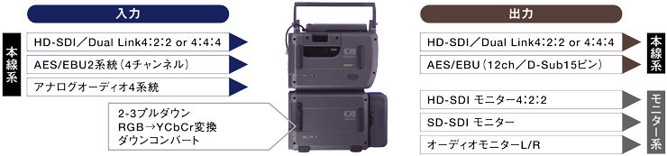 映像は、HD-SDIまたはHD-SDI Dual Linkによる本線入出力のほかに、HD-SDIモニター出力・SD-SDIモニター出力を装備。SRPC-1部で提供するRGB4:4:4→YCbCr4:2:2変換、2-3プルダウン、ダウンコンバーター機能により、フィールドでのモニタリング環境に柔軟に対応可能です。また、音声については、独立したアナログオーディオ入力(4ch)とAES/EBU入力(2系統/4ch)を装備。HD-SDIに重畳された音声含め、最大12chの音声記録が可能です。
