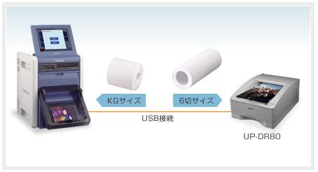 本機をデジタルフォトプリンター“SnapLab”(スナップラボ) UP-CR20Lと接続することにより、UP-CR20Lではサポートしていないサイズ「6切」「W6切」「10x20cmフォトカード」をプリントサービスに加えることができます。PCを必要としないこのシステムは、カレンダーなどのバラエティープリントだけでなくイベントフォトにも便利です。