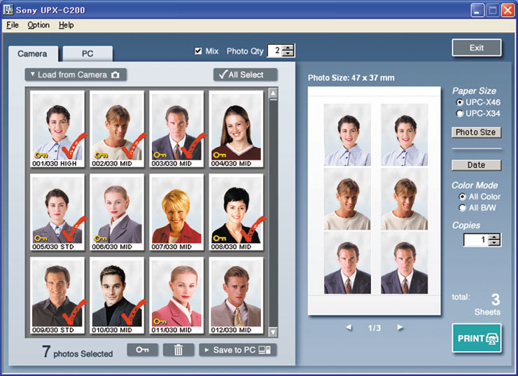 プリントサイズは、履歴書やパスポート等の各種証明写真に対応できるよう、22種類ご用意しています。1枚のプリントメディアに3人分の画像データをプリントしたり、異なったサイズの画像をプリントすることもできます。また、モノクロプリントにも対応しています。