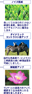 | 新開発・統合デジタル高画質システム「ベガエンジン」は、BS・110度CSデジタル放送や地上波アナログ放送、DVDなど、入力されたあらゆる映像ソースを映像処理回路の入口から出口までフルデジタル処理。A/D(アナログ/デジタル)、D/A(デジタル/アナログ)変換の繰り返しによるノイズの発生や信号劣化を防止し、DRC-MF V1やMID-XUといったソニー独自の高画質技術の能力を最大限に引き出すことが可能に。入力された映像ソースを鮮鋭度の高い、立体感までも感じさせるリアルな画質で再現します。 |