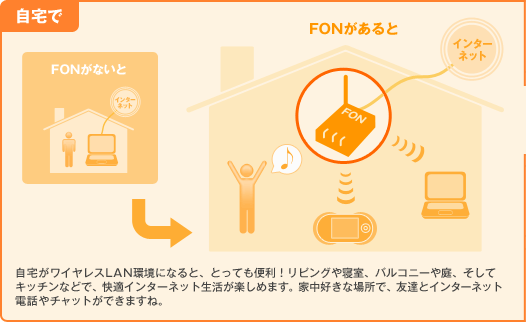 自宅がワイヤレスLAN環境になるFON。便利そうだけど…接続方法やサービスが少しわかりにくいと思っているあなたに、イラストや写真を使ってご説明します。見て、わかって快適なワイヤレス生活を楽しんでください!