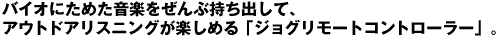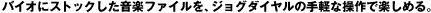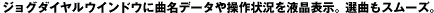 クルクルピッピッのジョグダイヤル操作で、「再生/一時停止」「曲送り」「曲戻し」も手軽に操作。ポータブルプレーヤーを操作するような軽快さで音楽が楽しめます。さらに、ジョグダイヤルウインドウに操作状況はもちろん、「SonicStage」で管理する曲名データも表示可能。バイオに録音した大量