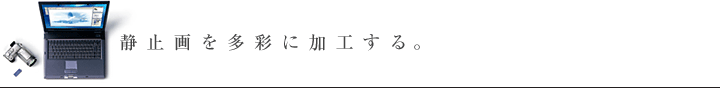 | 映像の変わり目は、「キューブスピン」や「グラデーションワイプ」など、15種類のトランジション効果で演出。テレビ番組のような画面切り換えが楽しめます。また、縦や横に文字が移動するスクロールタイトルを制作して、映像に重ね合わせることができます。 |